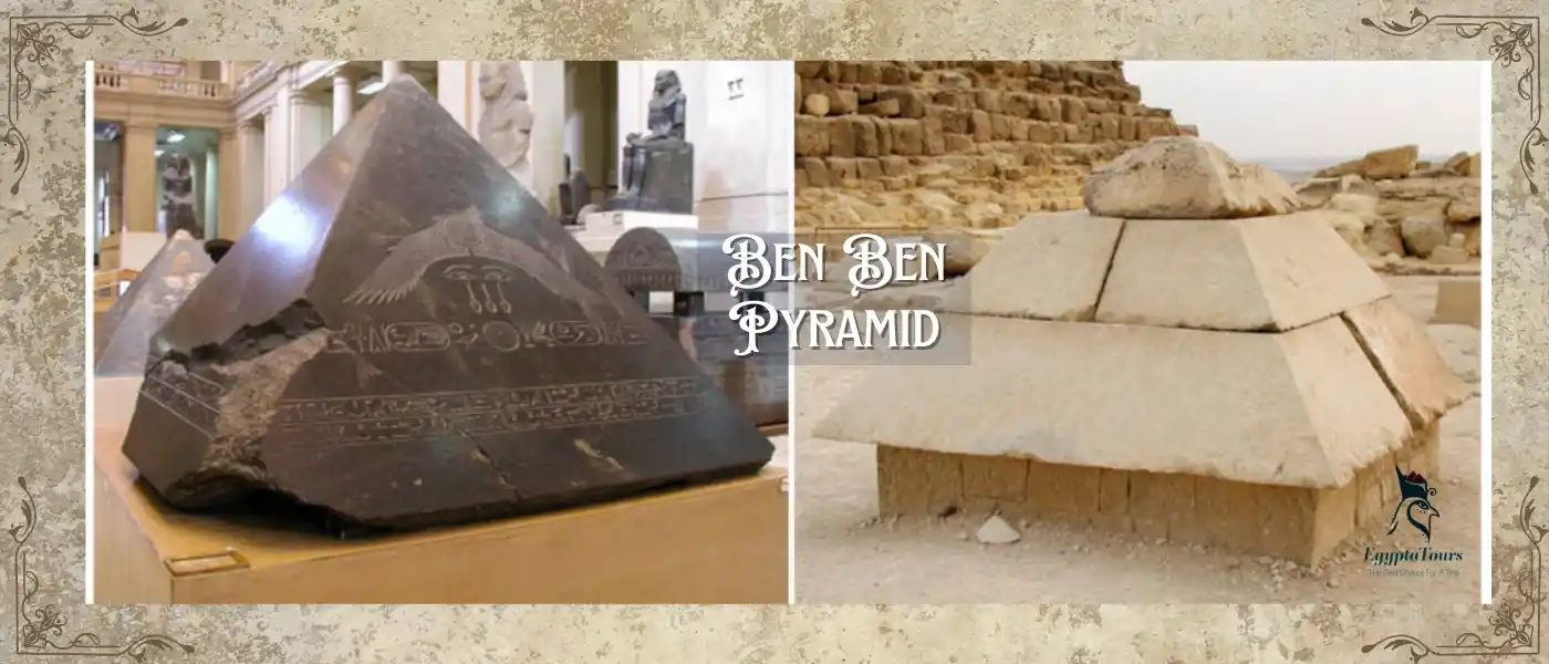 Replicas of it are also found in museums such as the Egyptian Museum in Cairo where small pieces in the shape of an inverted pyramid are displayed which may represent bin bin or a symbolic repetition of it.