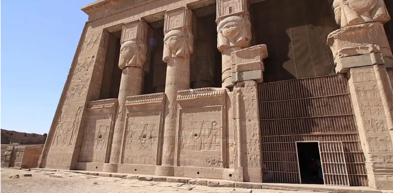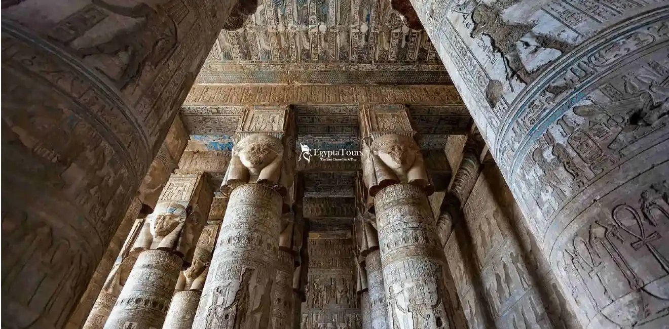 The Temple of Dendera is considered one of the greatest Egyptian temples, as it preserves many important scenes that tell us about the religious and artistic life of ancient Egypt. On the ceiling of this magnificent temple, there is a unique and meaningful scene showing the goddess Hathor surrounded by her children. This scene clearly reflects her sacred role as a protective and caring mother, as well as a divine source of inspiration.