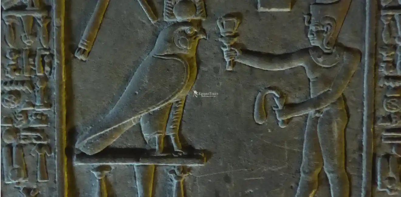 To the right of Hathor stands Horus Sematawy. He represents the divine king and the unity of Upper and Lower Egypt. His position beside Hathor shows their sacred relationship. In some myths, Hathor was believed to be his mother or his wife. Horus is shown wearing the double crown which clearly represents his authority and his role as the ruler of the whole country. Through this image, Horus stands for power, order and stability.