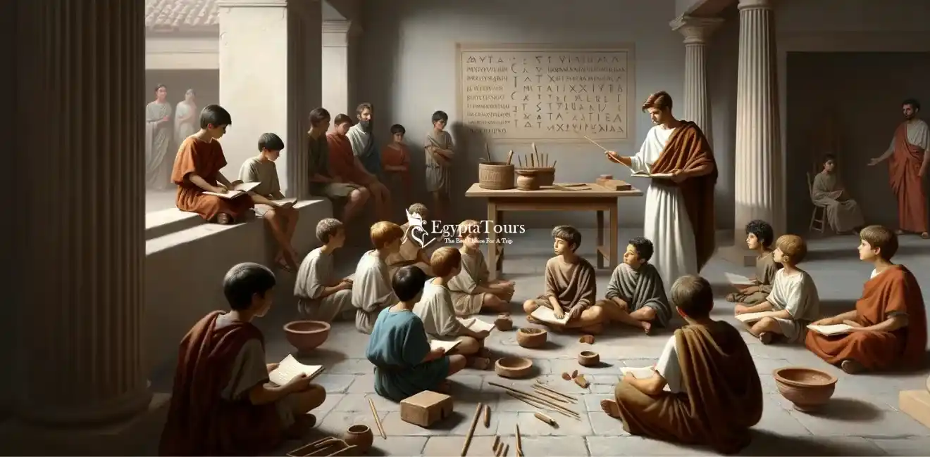 Roman education emphasized moral values, practical skills, and Greek-Latin literature. Boys learned rhetoric and public speaking for leadership, while girls from elite families were educated in reading, writing, and arts. Pedagogues often supervised young children, and advanced education was available for social advancement.