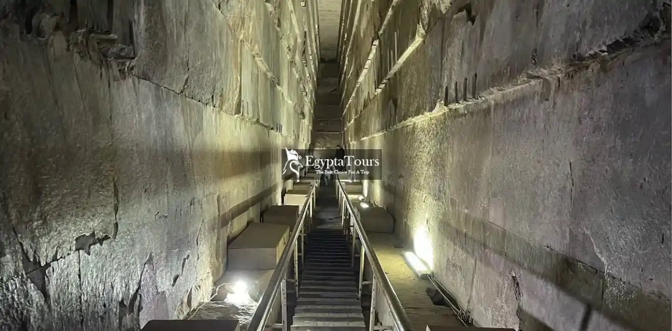 One shaft leads to the Queen’s Chamber while another leads to an exit near ground level on the north side of the pyramid.