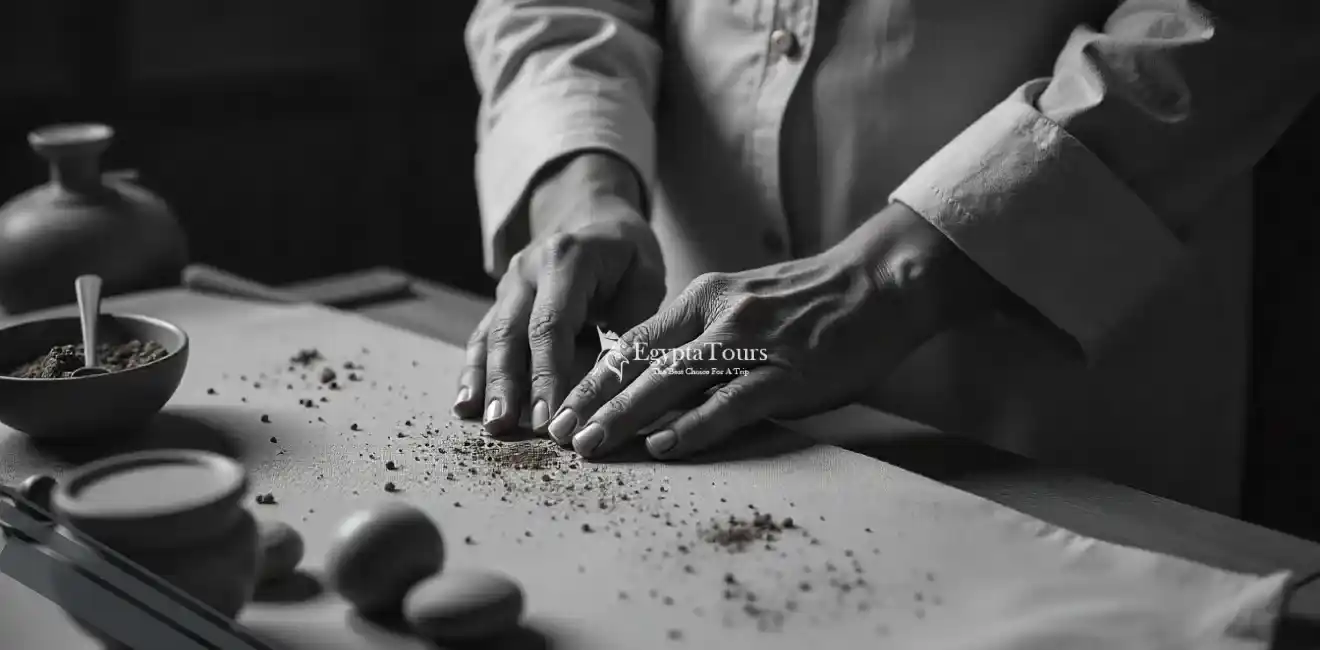- This stage reveals a key secret of Egyptian mummification, where the body is cleansed of its dominant color and water by placing a large amount of natron salt on it.