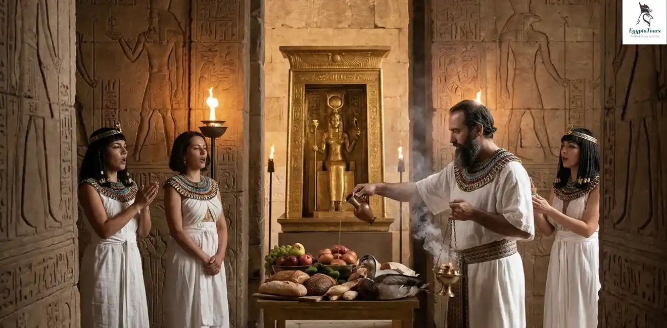 A priest would go into the temple, where statues of the gods were kept. The statues were cleaned, dressed and decorated with small items. The priest would then give food and drink, such as bread, meat, fish and wine, to the statues, and also present a figure of Maat, the goddess of harmony, justice and truth.
