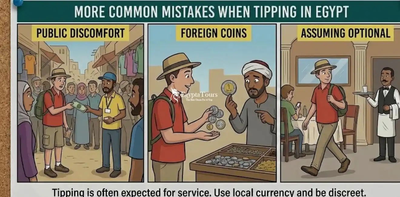 One of the most common mistakes is not leaving any tip at all which is considered impolite especially in restaurants, hotels and transportation. Giving very small amounts that are not commensurate with the level of service is another common error. Additionally, some tourists try to negotiate the tip amount after receiving the service which is considered inappropriate in Egyptian culture.