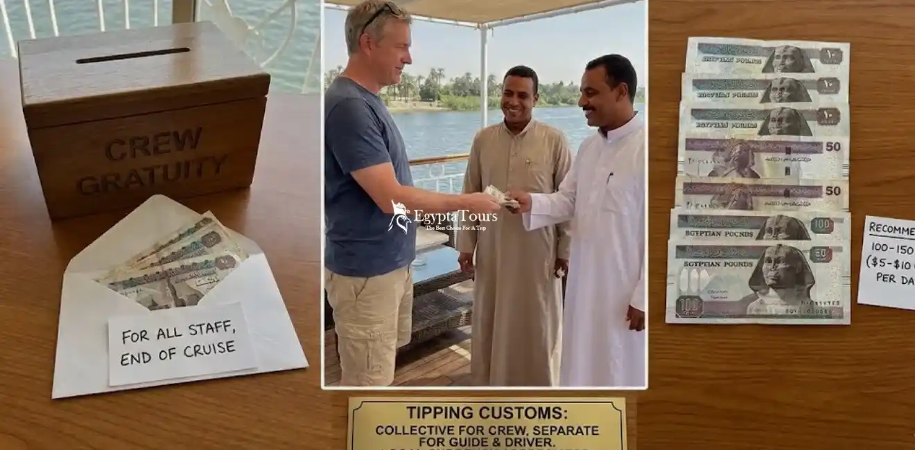 Tipping on a Nile cruise in Egypt is customary and often expected, as cruise staff rely on tips as part of their income. Most travelers tip between $5–10 USD per person per day, or the equivalent in Egyptian Pounds (EGP). Tips usually cover the entire crew, including housekeeping, dining staff, and support personnel. Some Nile cruises provide a tipping envelope or recommend a fixed daily amount, but tipping should always reflect the quality of service you receive.