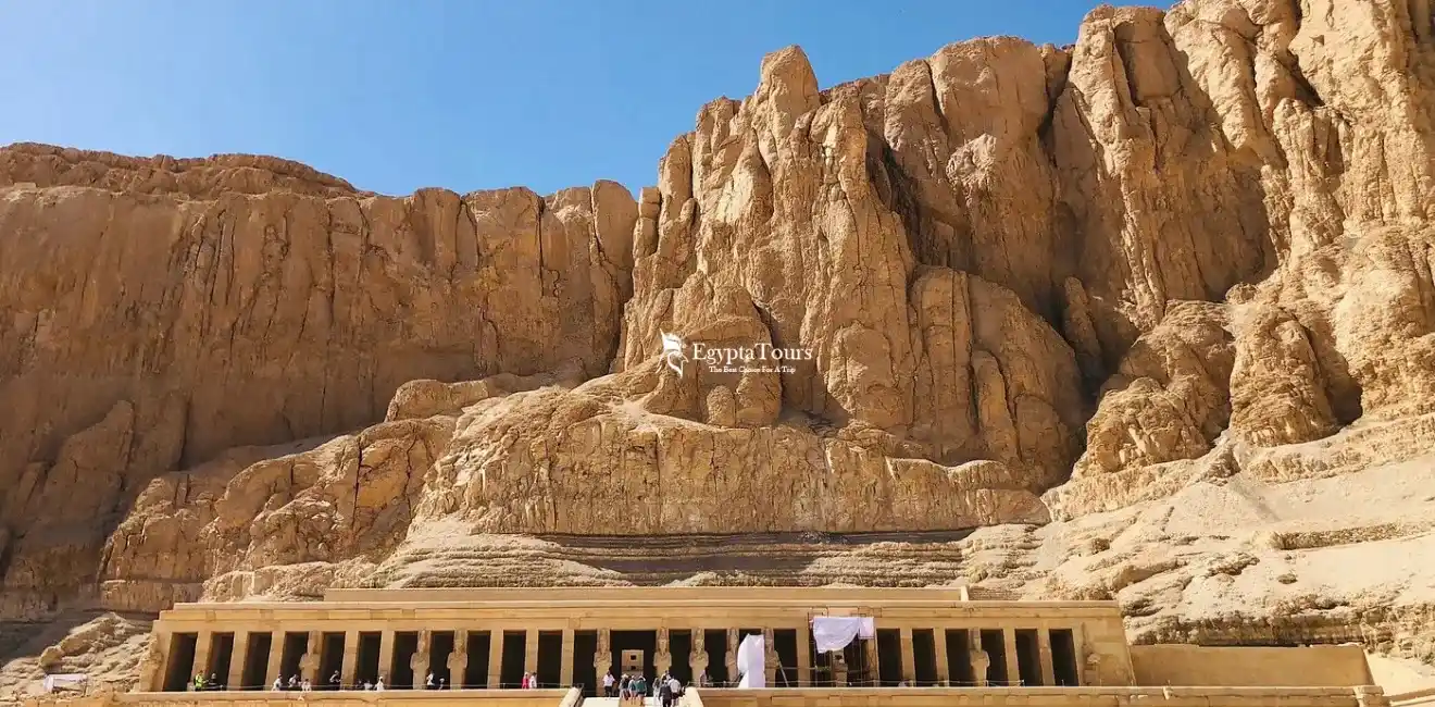 The Mortuary Temple of Hatshepsut, which is one of the best-preserved temples from ancient Egypt. It was built by Queen Hatshepsut and is known for its unique architectural style, featuring a series of terraces and ramps. The temple is constructed from limestone and contains statues of Queen Hatshepsut and the god Osiris. Its walls are adorned with reliefs depicting the queen's successful trade expedition to Punt.
