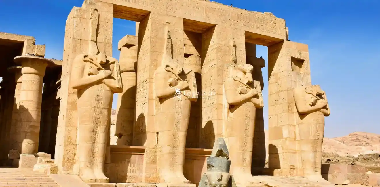 The Ramesseum is a mortuary temple built By <strong>Ramses II in Thebes</strong>, Upper Egypt. The temple features massive statues of Ramses II and important inscriptions depicting his life and the Battle of Kadesh, where he defeated the Hittites.